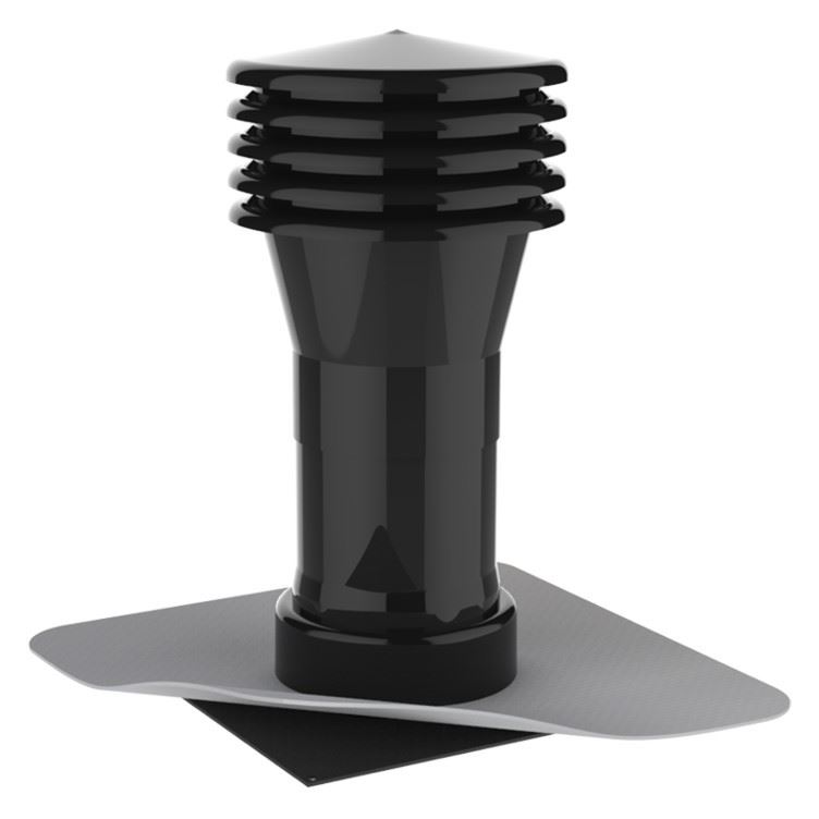 Střešní odvětrávací komínek TOPWET s integrovanou manžetou z hydroizolační fólie na bázi EVA, včetně dešťové krytky. Výška 300 mm, na zakázku možnost prodloužení až do 500 mm. V černé barvě.